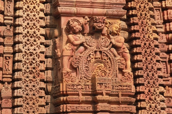 The deul (gopura) is also lavishly done in stone and is pancharatna in style. The carvings on the exterior are exquisite. There are graceful nayikas in alto-relievo, naga-nagi pillars, bhara-raksasas, elegant arabesque motifs, etc. Even the vent to let out the abhisheka water and liquids is carved to glory!